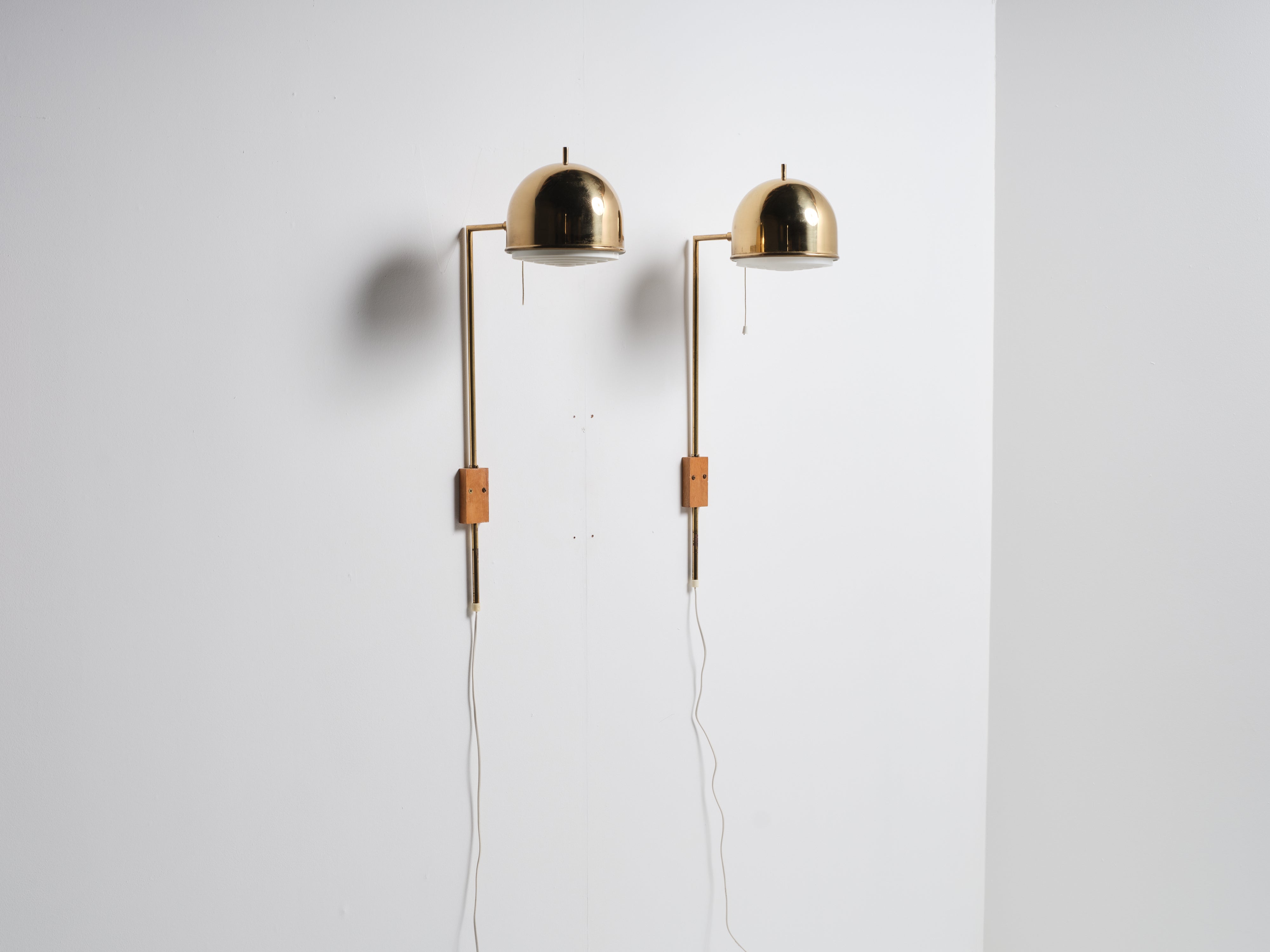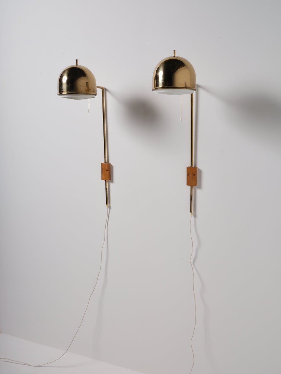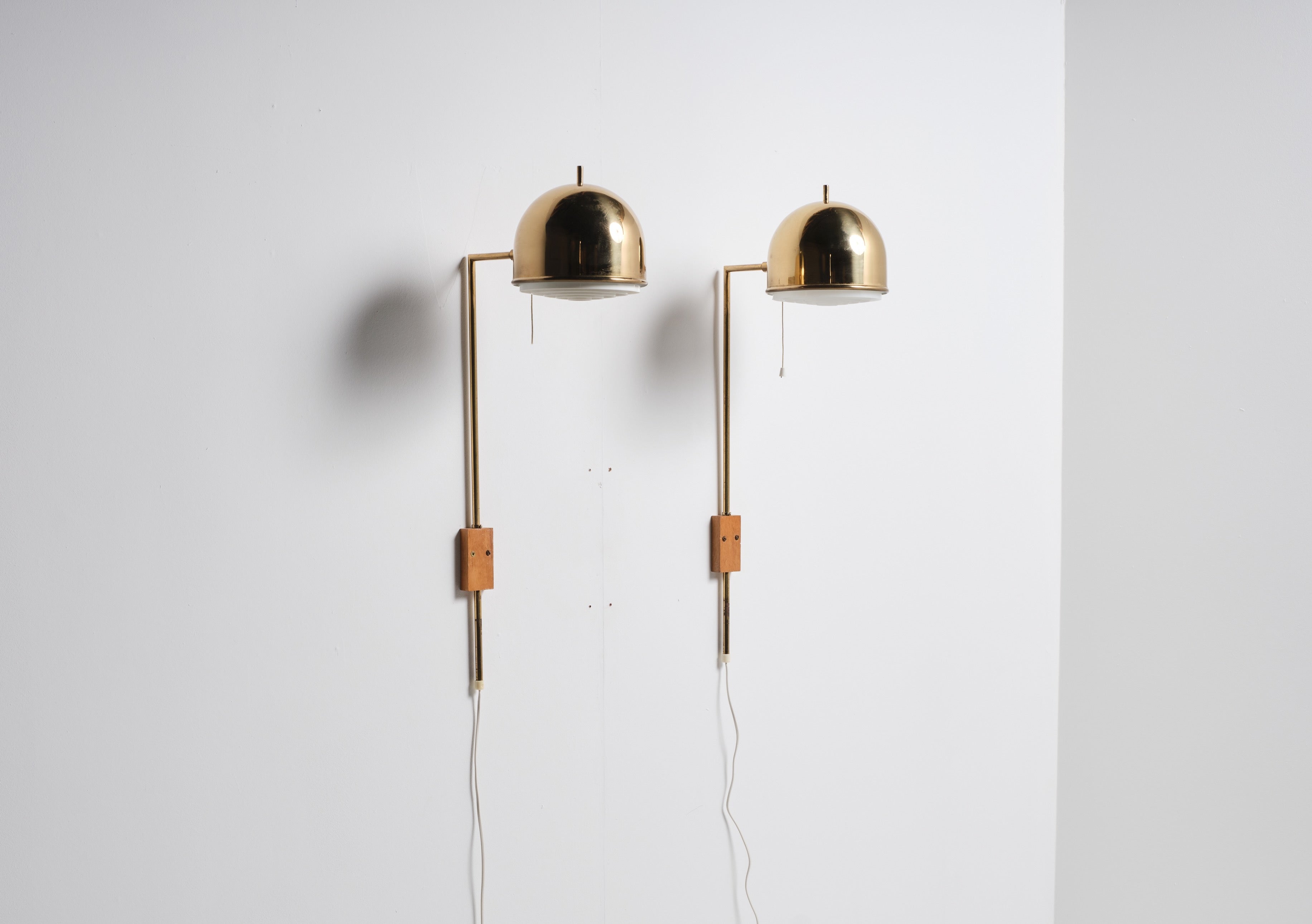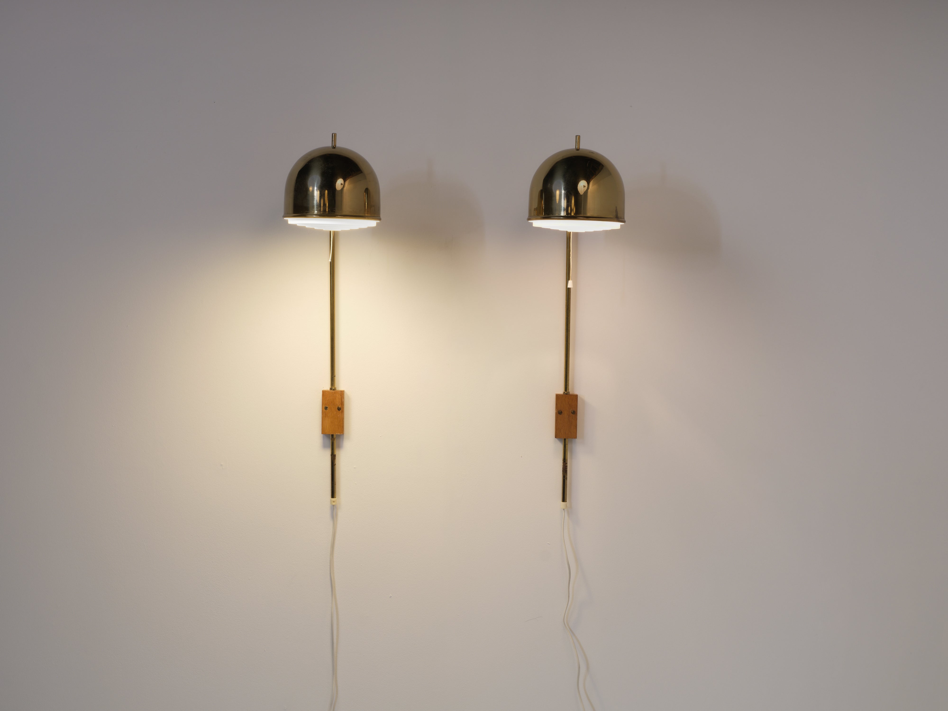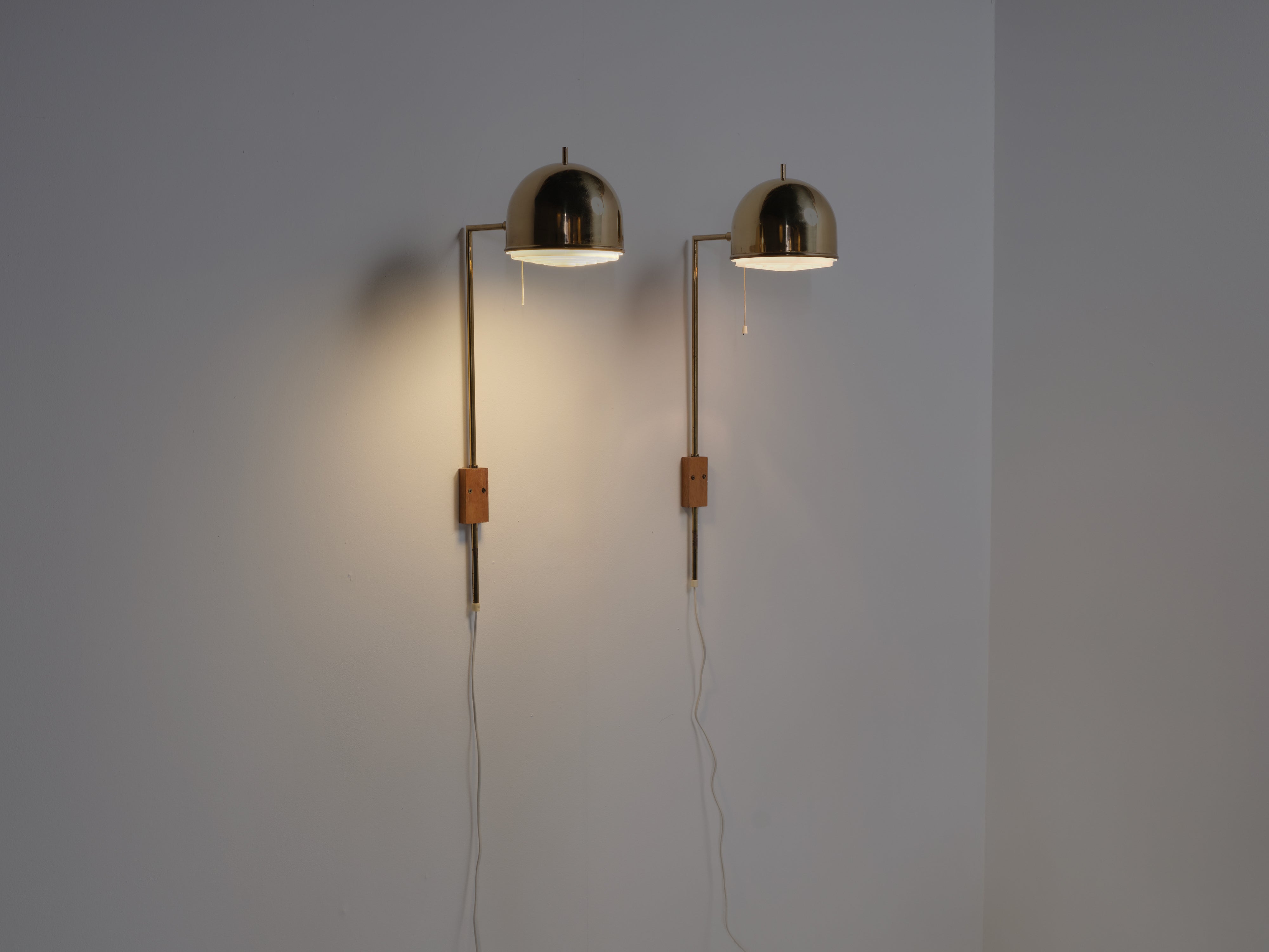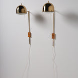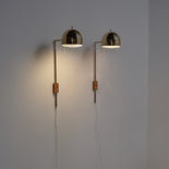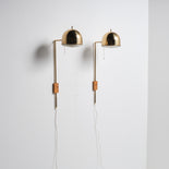 A nice pair of brass model V-75 wall lamps, designed by Eje Ahlgren for Bergboms, Sweden, 1960s. Priced and sold as a pair. These examples in great condition for their age. The lamp heads do articulate up and down. Fast shipping worldwide.