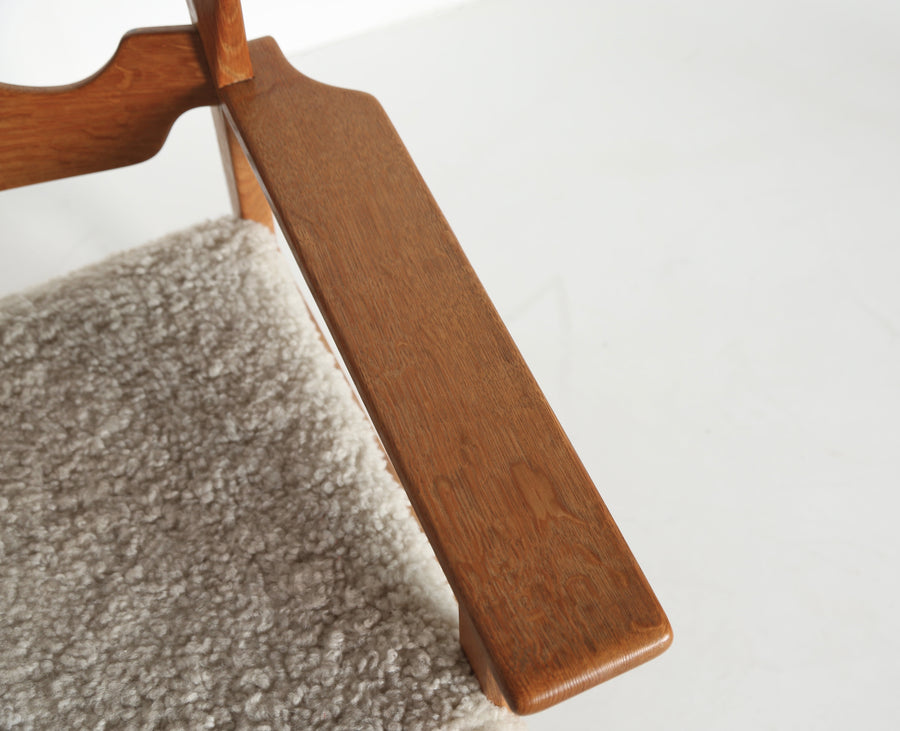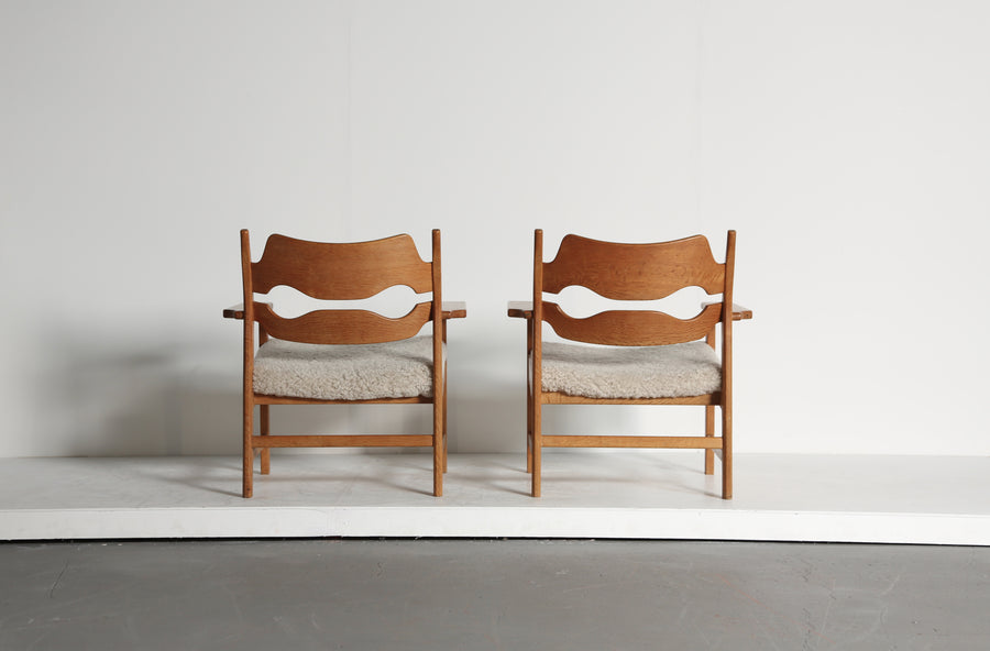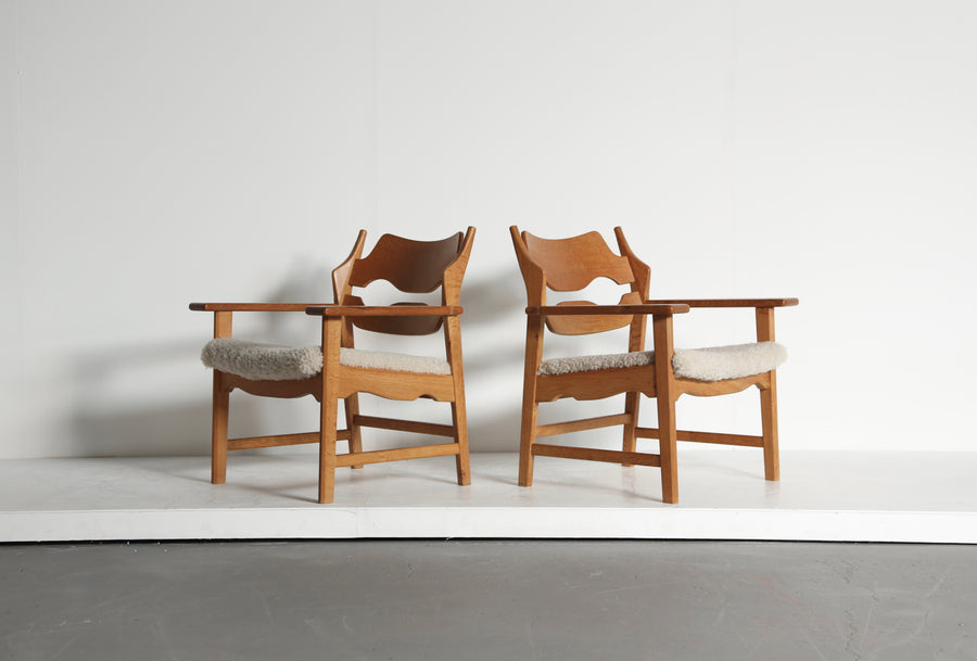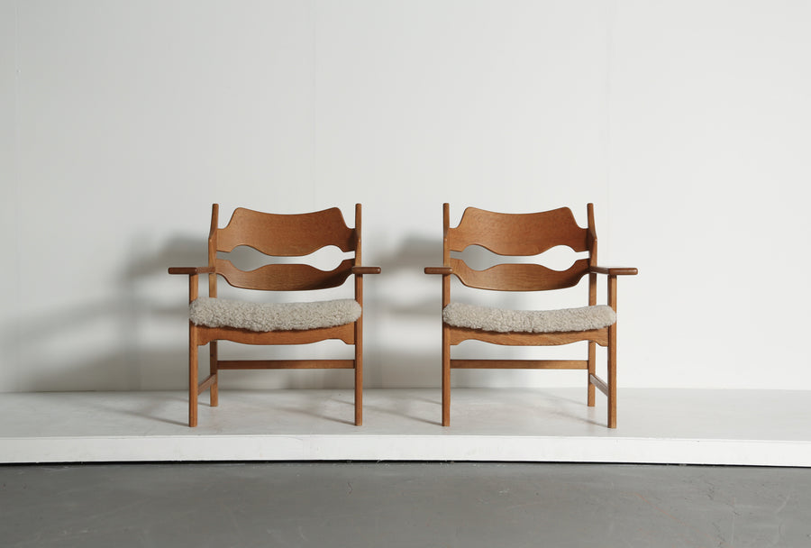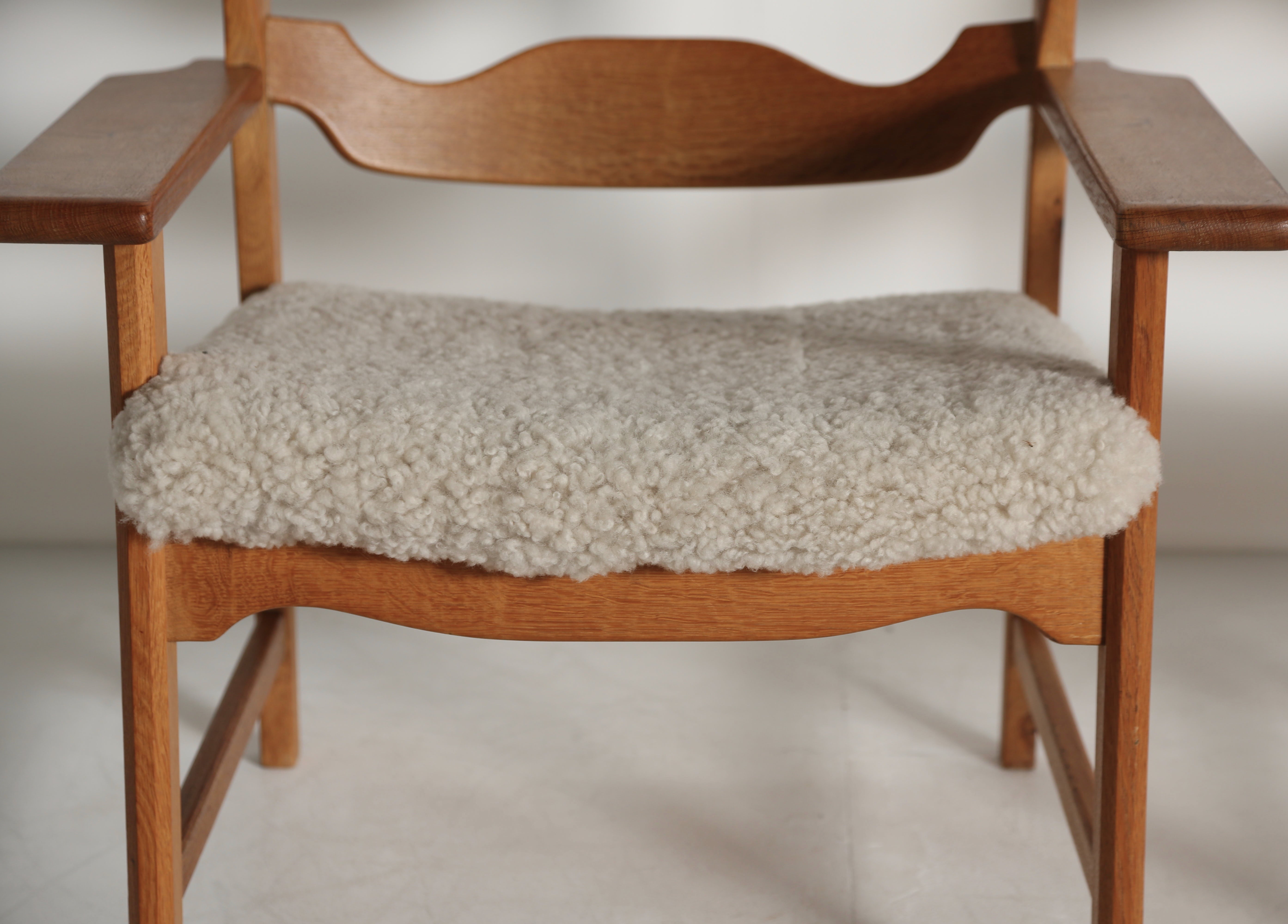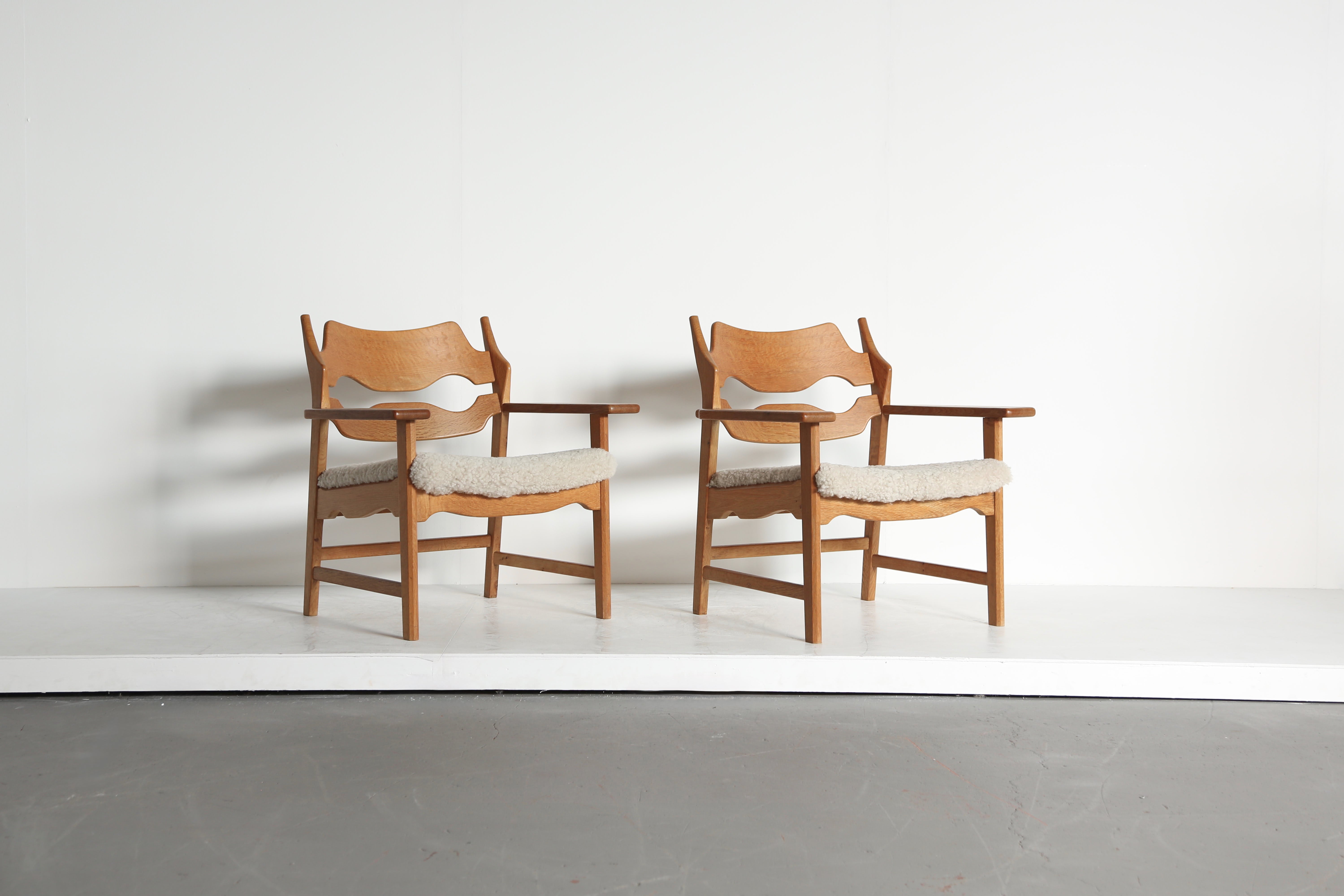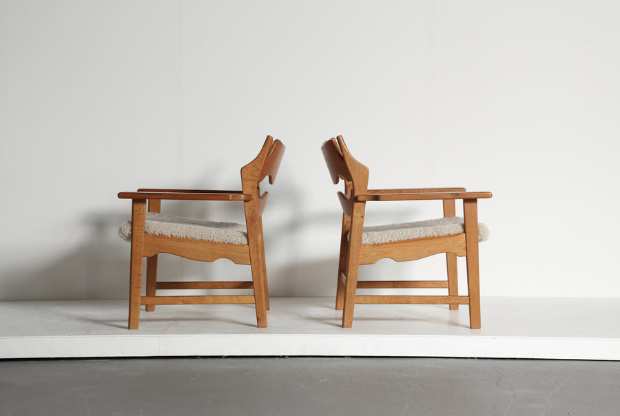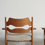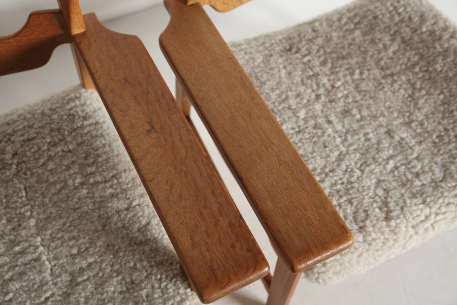 A superb pair of razor blade armchairs by Henning Kjærnulf, Denmark, 1960s. Oak frames in great original condition with a nice even tone and patina. Seats recovered in sheepskin. Fast shipping worldwide.