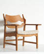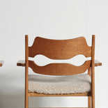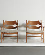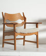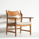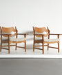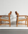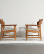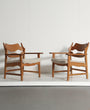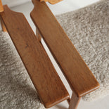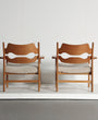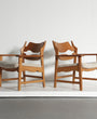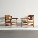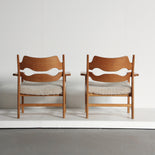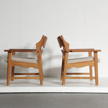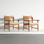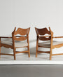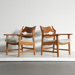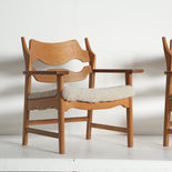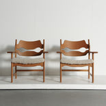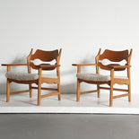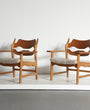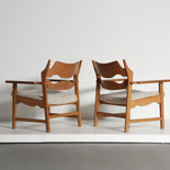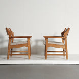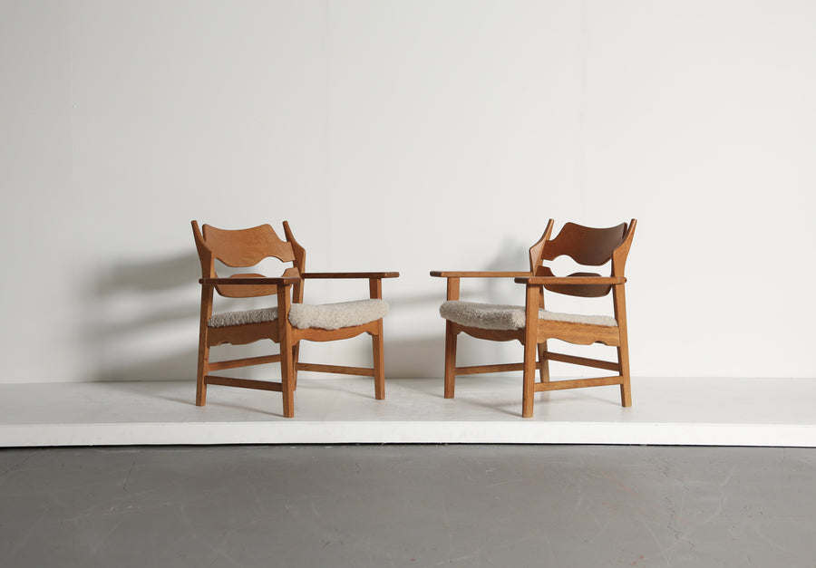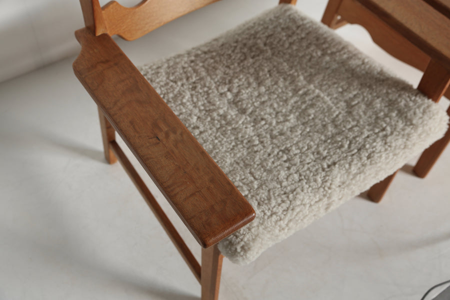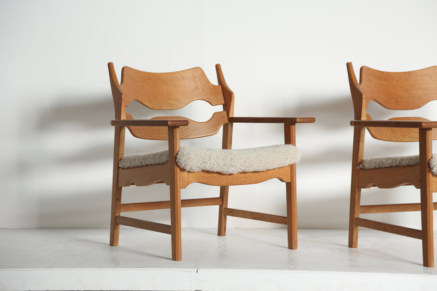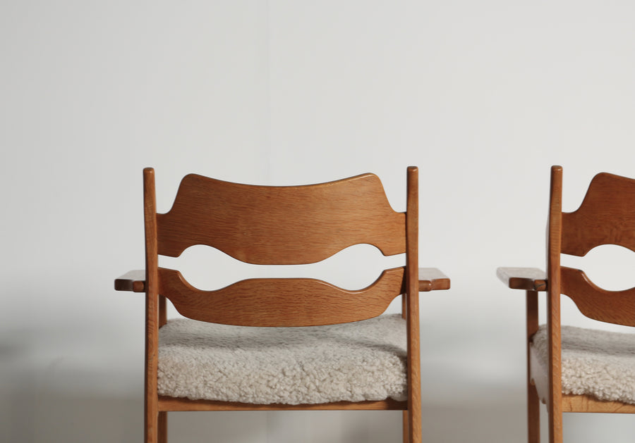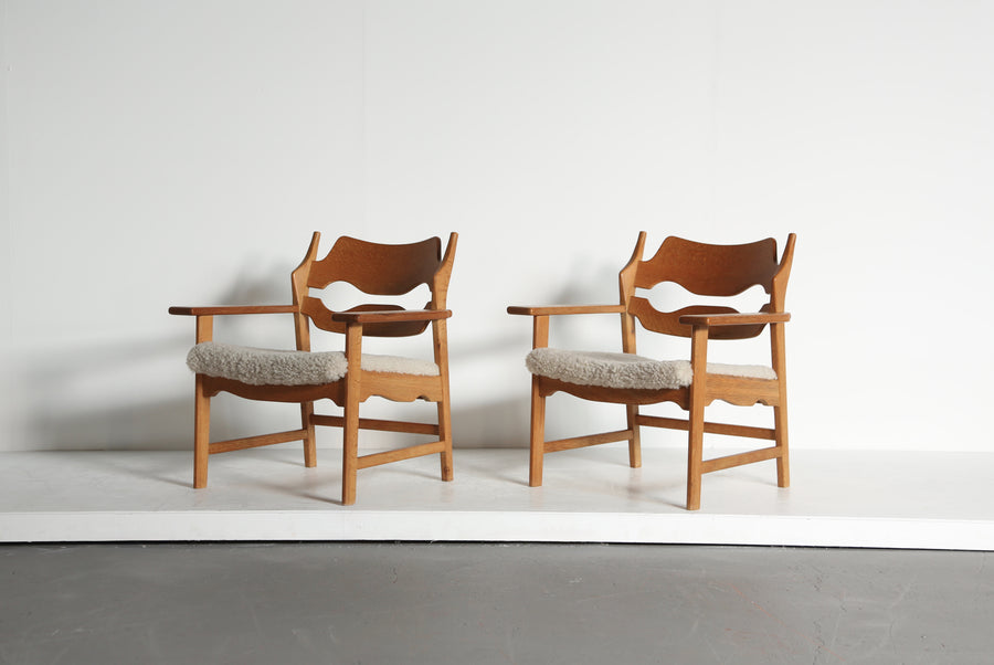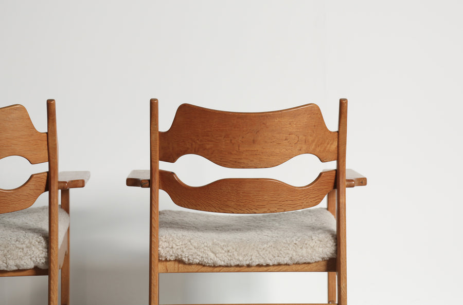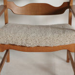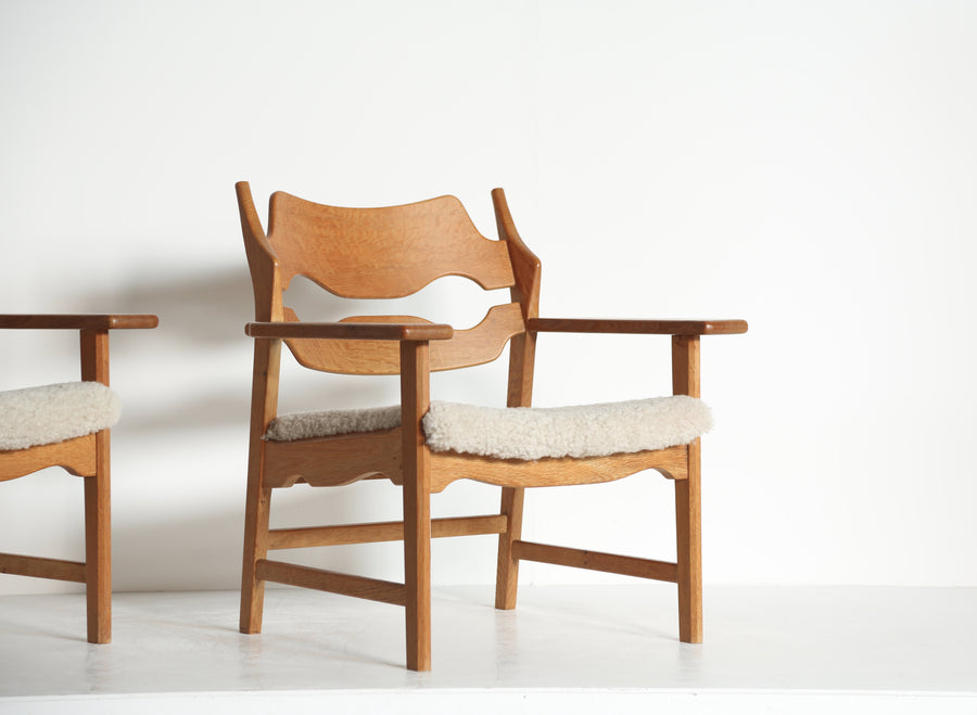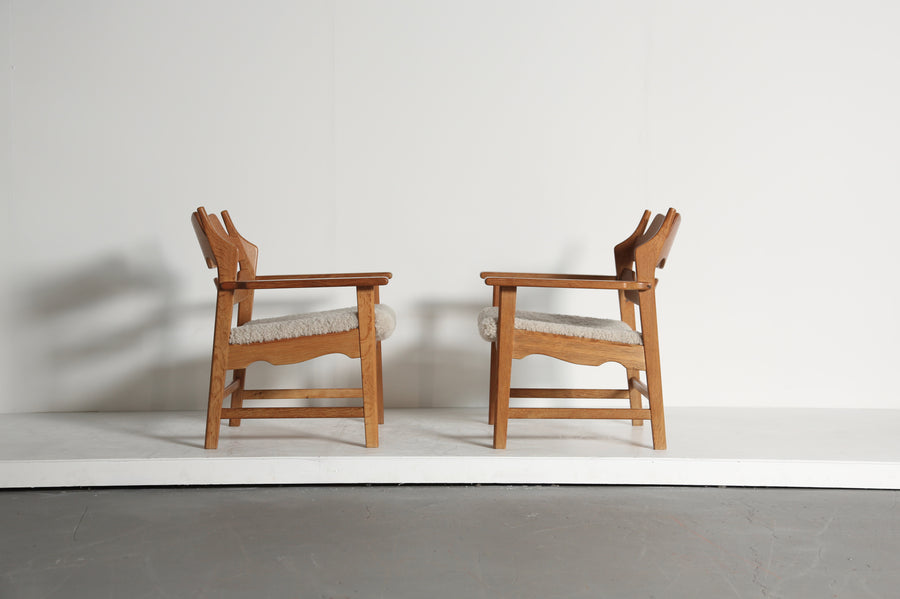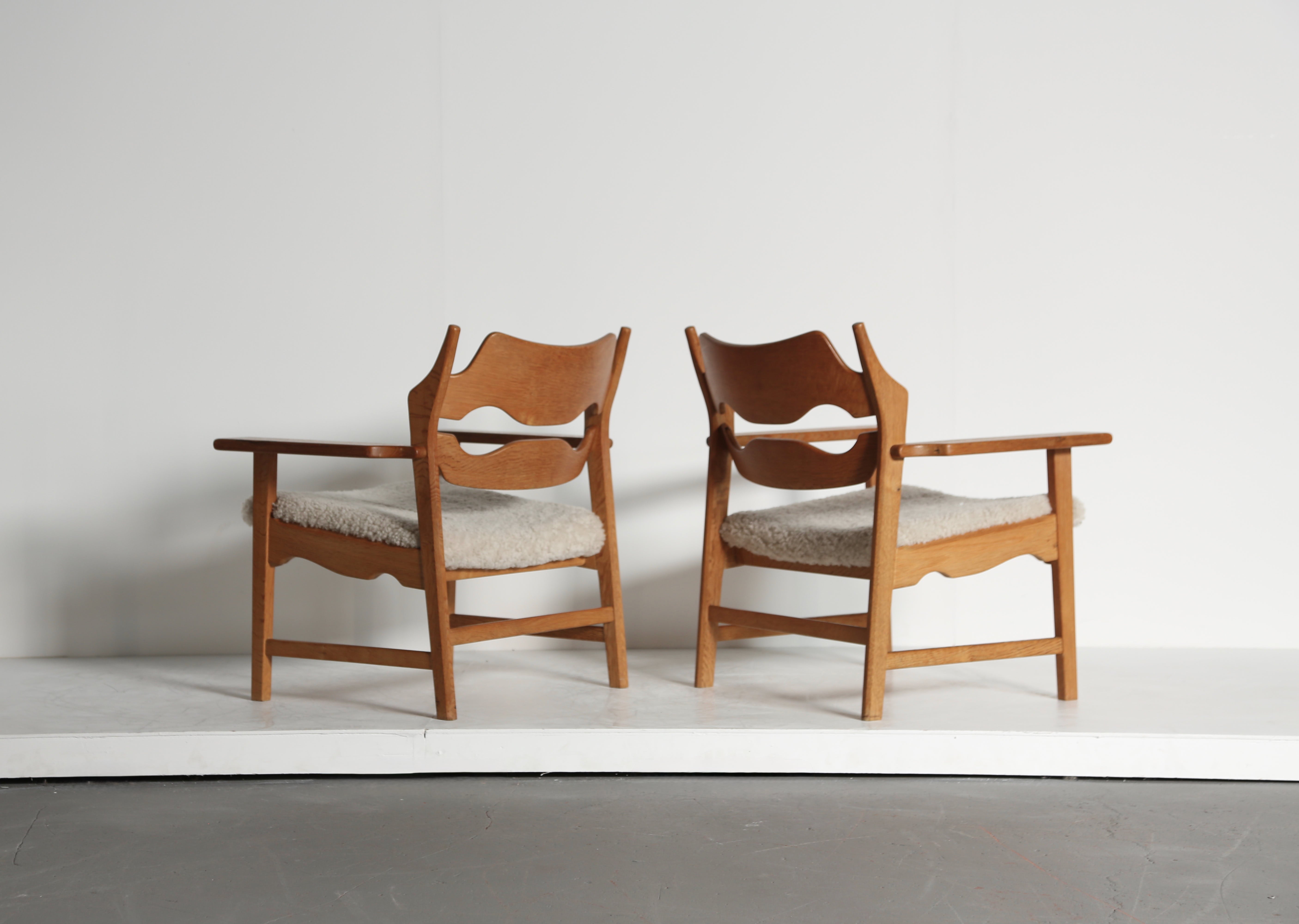 A superb pair of razor blade armchairs by Henning Kjærnulf, Denmark, 1960s. Oak frames in great original condition with a nice even tone and patina. Seats recovered in sheepskin. Fast shipping worldwide.