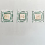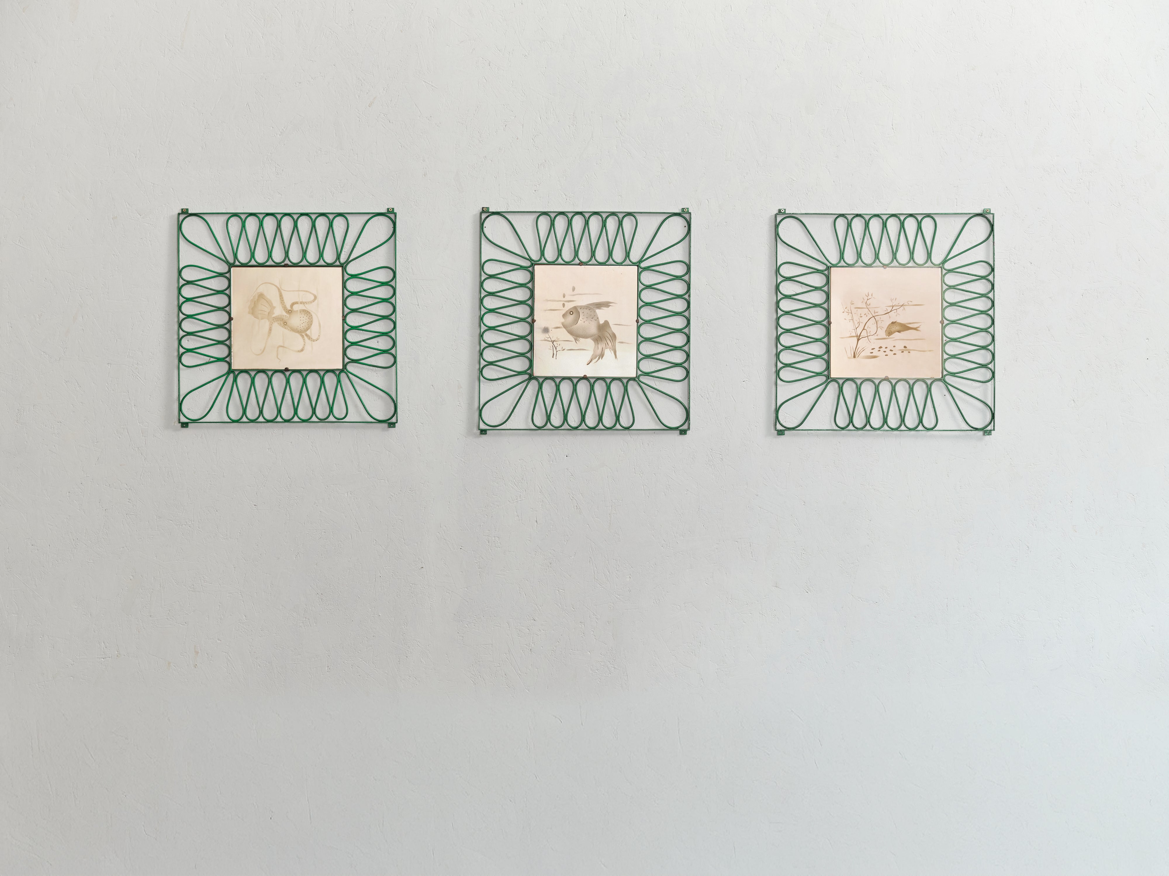 Unique Osvaldo Borsani Mirror / Frames, Arredamenti Borsani, Varedo, Italy, 1950s. From a private Milanese villa. We have a large collection of these mirrors available (only three are shown here). Green painted metal and hand etched rose glass showing an octopus and fish. Several pieces with different designs available. The etched glass can be removed with the pieces being used as frames or standard mirrors if desired. Fast shipping worldwide.